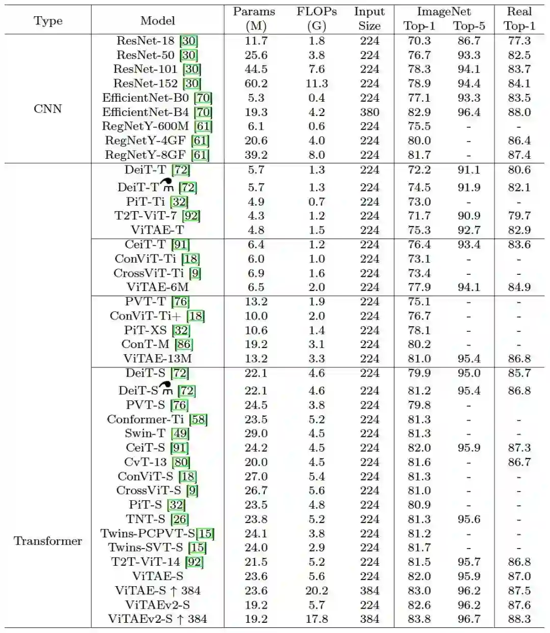 我们所提出的大规模ViTAE模型的效果如表1所示,引入归纳偏置的ViTAE-B模型相对于不包含归纳偏置的ViT-B模型有0.4%分类准确度的提升。类似的,对于更大尺寸的模型,例如ViTAE-L(311M),引入归纳偏置仍然可以带来0.3%分类准确度的提升。如果使用ImageNet数据集本身提供的22k版本进行微调,大规模的ViTAE模型还可以有1.0%左右准确的提升。此外,仅仅使用ImageNet-1K数据集进行训练时,我们所提出的ViTAE-H(644M)模型在ImageNet-Real数据集上达到了91.2%的分类准确度,超过了使用额外数据进行训练的3B规模的ViT-G[6]模型,在目前已知方法中排名世界第一。[https://paperswithcode.com/sota/image-classification-on-imagenet-real]