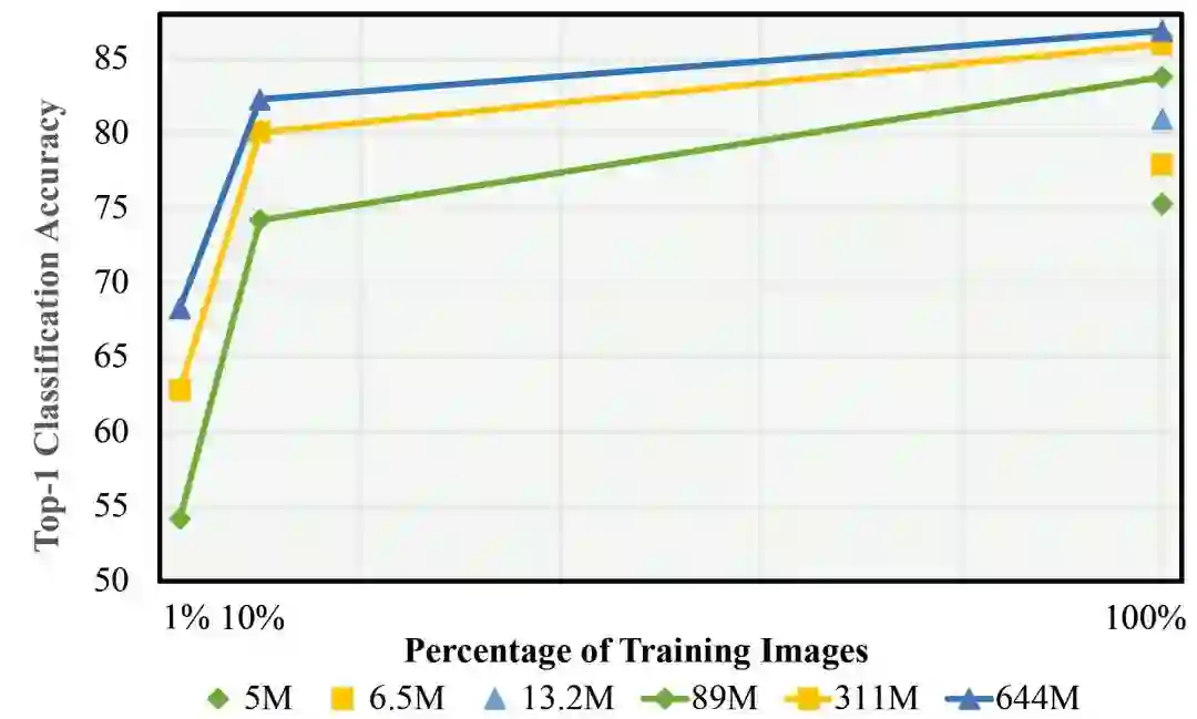 此外,我们还探索了大规模ViTAE模型的少样本学习能力。我们分别使用1%,10%,和100%的数据对大规模ViTAE模型进行了微调。结果如图2所示,仅仅使用10%的数据进行训练,ViTAE-H模型的分类准确度达到了82.4%,超过了小规模模型ViTAE-13M使用100%数据进行全监督训练的准确度(81.0%)。这说明了大规模模型具有很强的少样本学习能力。