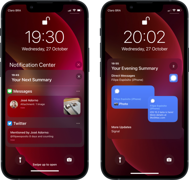 第二处更新就是在 iPhone 和 iPad 锁屏上重新设计了通知摘要。通知摘要是此前 iOS 15 第一个版本推出的新功能之一,可在用户选择的时段呈现每天收到通知的实用摘要,而且会根据用户与 APP 的互动情况排列通知摘要优先级,把最相关的通知置于顶部。此次 iOS 15.2 Beta 中通知摘要具有浮动卡片的功能,其颜色与应用程序图标相同,点击展开时,所有的通知都会显示在主卡内,而不是像 iOS 15.0 和 iOS 15.1 中那样单独显示。