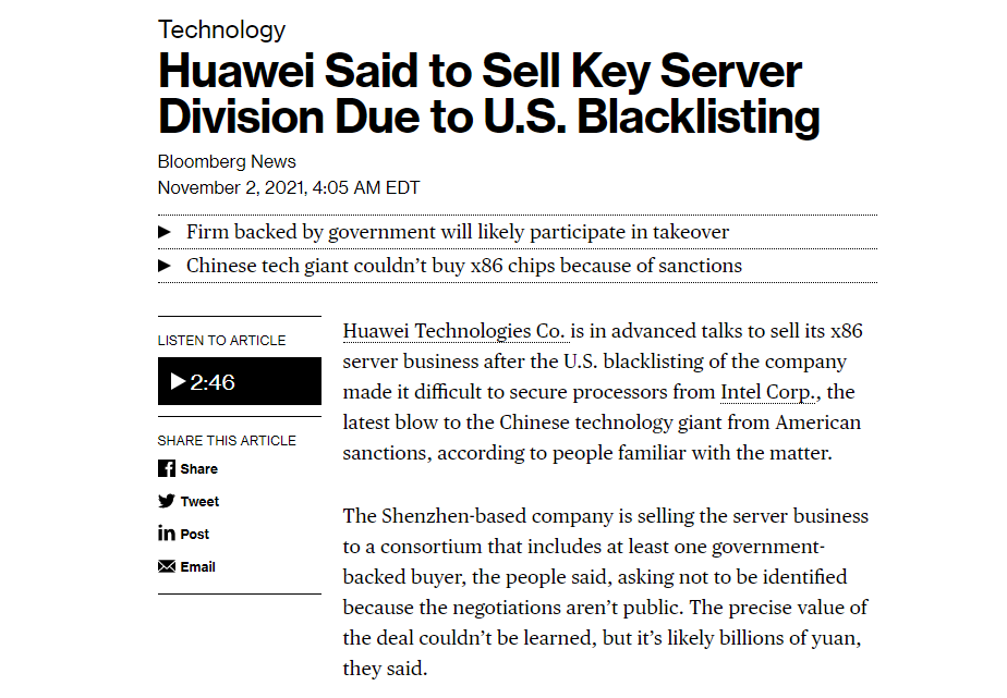 据彭博社报道,华为将出售其 x86 服务器业务,外媒预测出售华为服务器部门有关的款项大概有几十亿元,其中河南信息产业投资有限公司和一家位于郑州的曾是华为供应链厂商的国有企业计划收购,还有知情人士爆料消费电子制造商华勤科技有限公司和一家代表湖北国资的公司也参与了谈判。