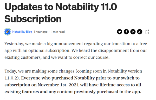 昨日苹果 iOS 手写笔记应用 Notability 更新由原来的买断制变为了订阅制,随后遭到众多网友不满并投诉,今日,Notability 向用户发送邮件致歉并在官方平台宣布,将推出 Notability 11.0.2 版本。
