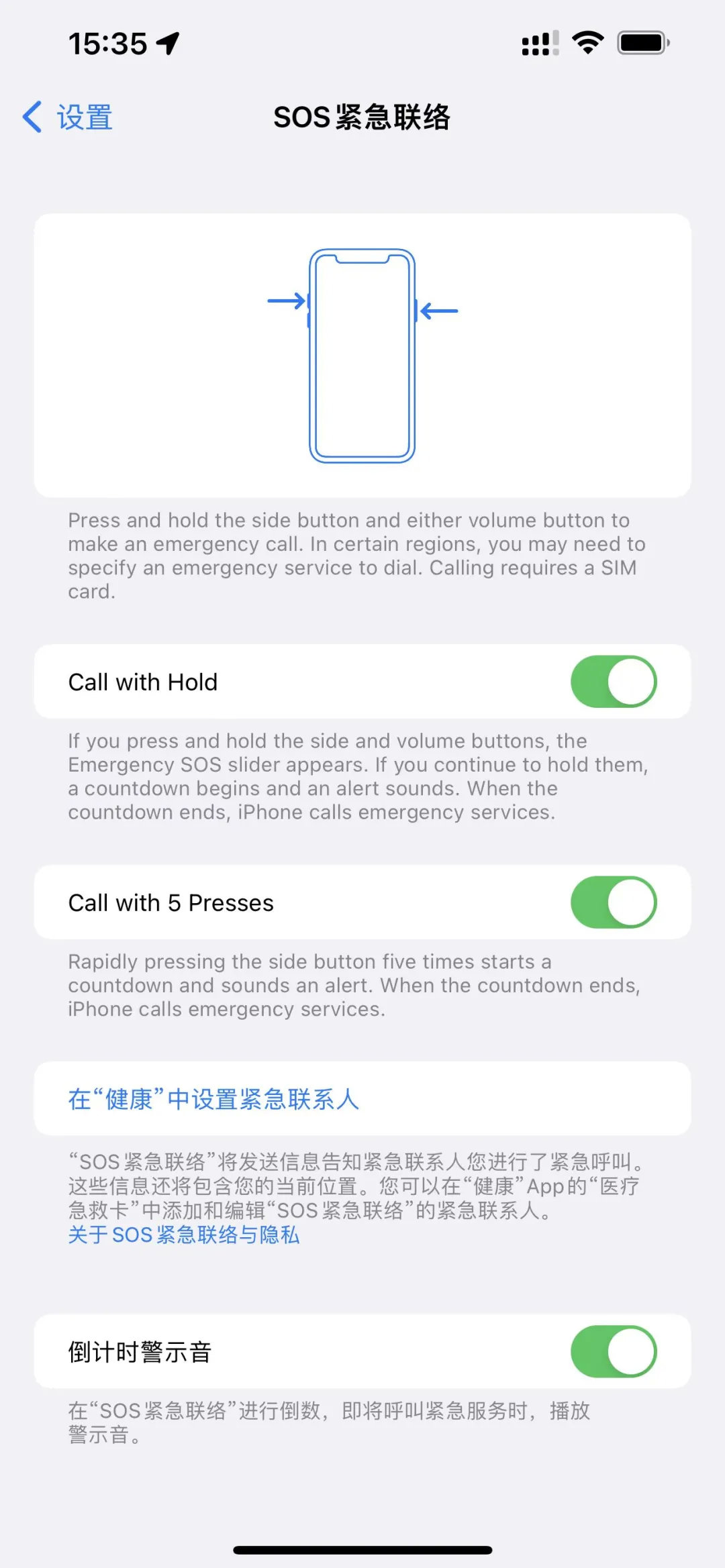 第三处更新了紧急呼叫功能。在 iPhone X 及之后的全面屏机型中,需要同时按住侧边按钮和电源键才可以触发紧急呼叫功能。iOS 15.2 中对这个功能进行了优化,能够用“同时按住侧边和电源键”或“多次快速按下侧边按钮”来触发紧急呼叫功能。