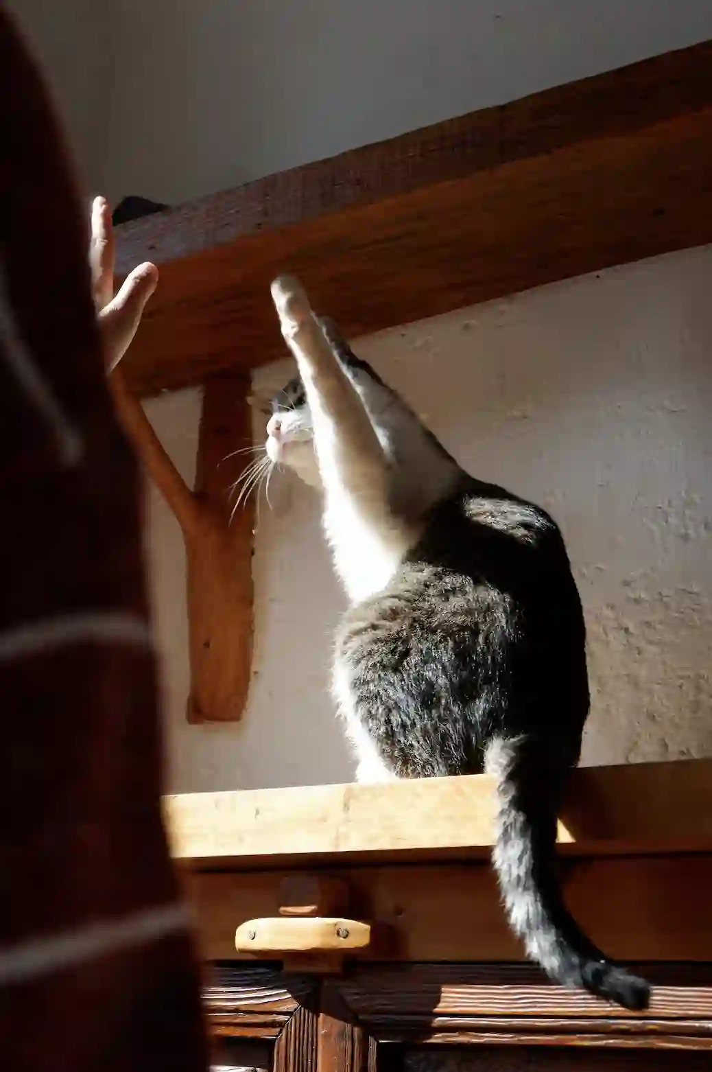 照片故事:在台子上摆各种 pose 给大家拍的寂照庵猫猫,抓拍到了猫猫和工友击掌的瞬间!(其实是想打人