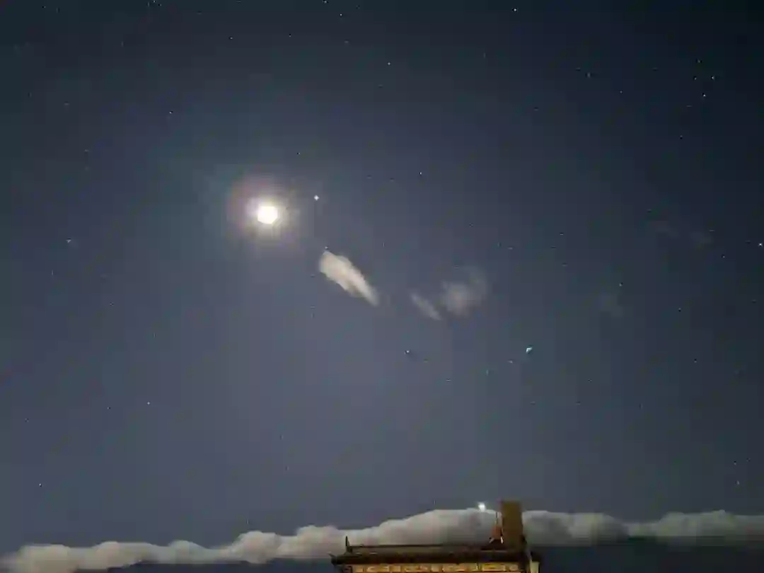 照片故事:三星一线,三星粉狂喜。照片中最亮的是月亮,月亮右边是木星,屋檐上方是金星,木星与金星之间最亮点是土星。(土星右边的月牙形状是鬼影,无中生月。)