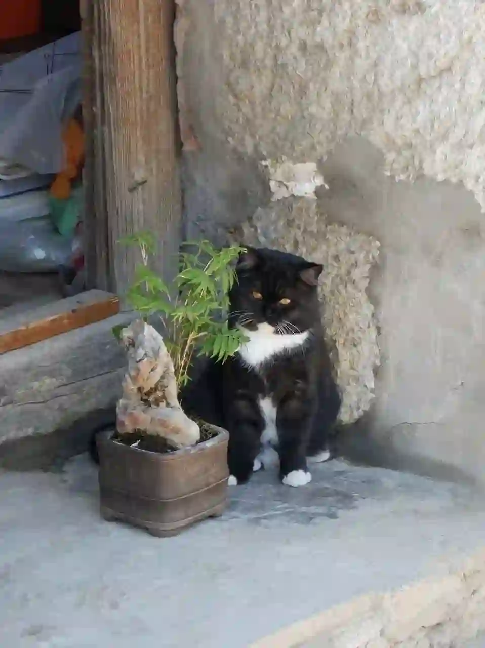 照片故事:和可爱工友在喜洲古镇无人的巷子里闲逛,发现一只躲在盆栽后面的猫猫,虎头虎脑。