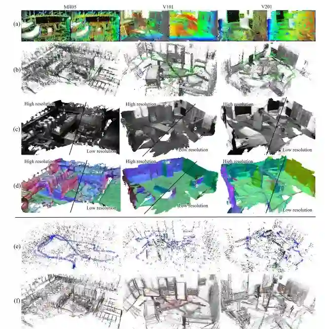 图1 重建结果 (a)实时稠密极值跟踪;(b)重建的三维点;(c)网格模型;(d)在不同尺寸的tsdf体素中通过所提议的稠密几何重建生成的正态映射;(e)orb-slam和(f)dso在同一场景中重建三维点。