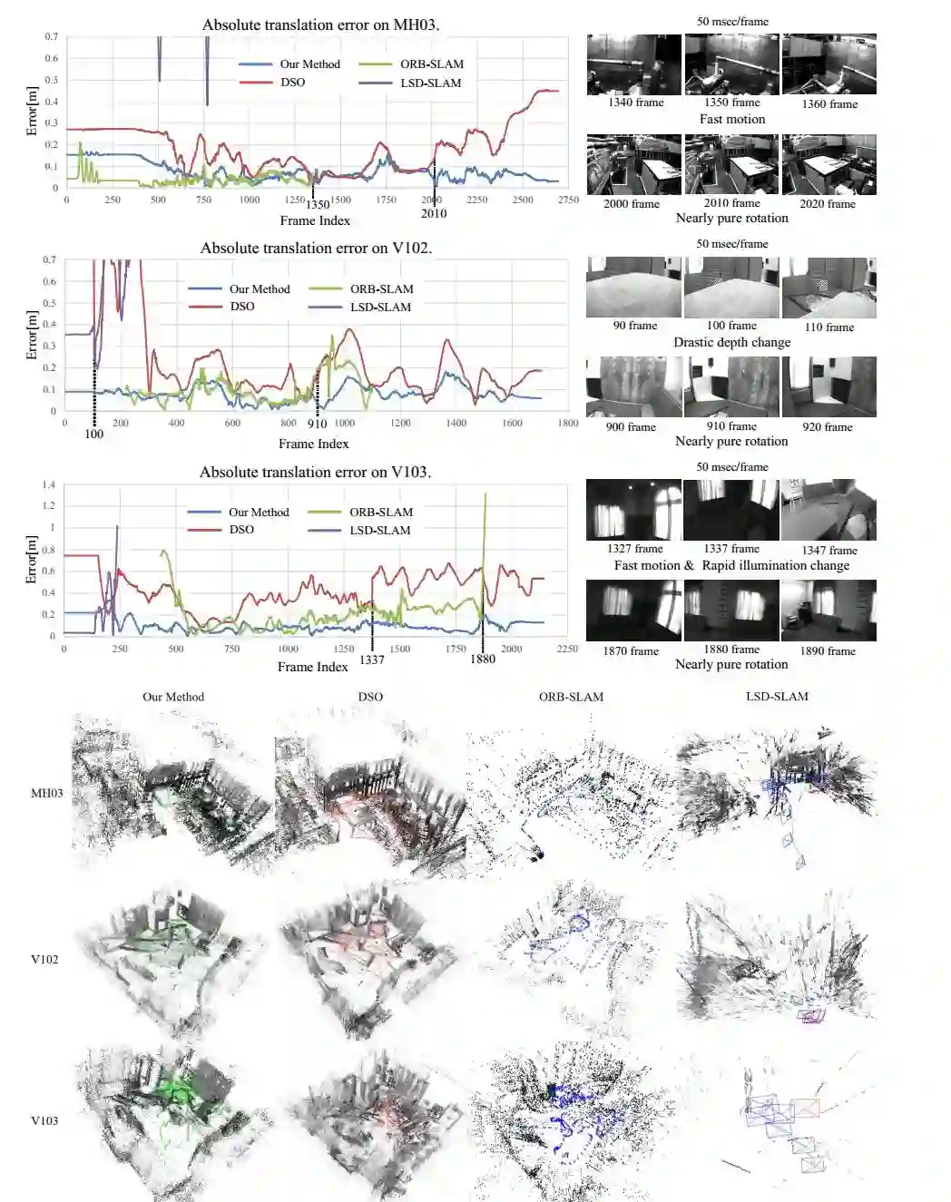 在每个场景中重建的点云:Vitamin-E成功地估计了摄像机的轨迹,尽管深度变化剧烈,几乎纯相机旋转,快速的摄像机运动和严重的照明条件,对比算法也在同样环境下测试,出现了较大的轨迹误差或完全丢失。