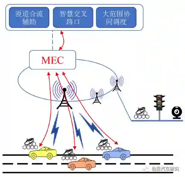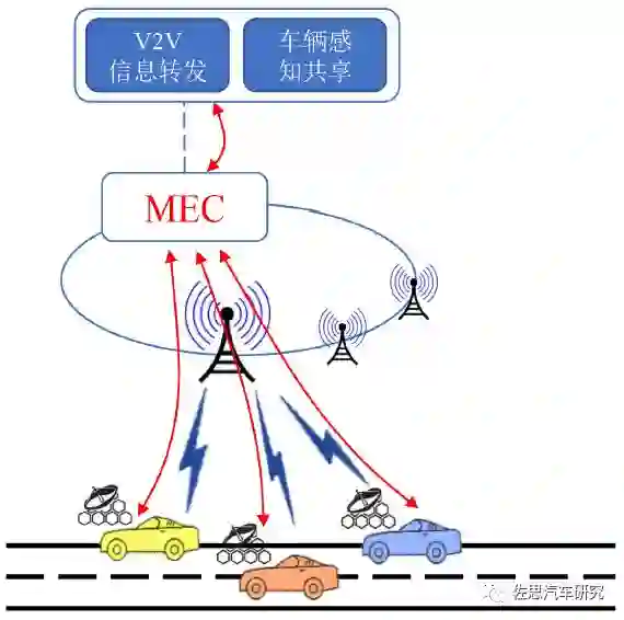 在此类场景中,MEC的部署位置可根据接入用户数和服务流量灵活选择,通常可选择部署在RSU或基站的汇聚节点后,为相对较大的范围提供服务。车辆无需装配智能传感器等设备,在网络部署了MEC及相应的功能服务后,具备对应通信模组的车辆可以直接使用此类服务。