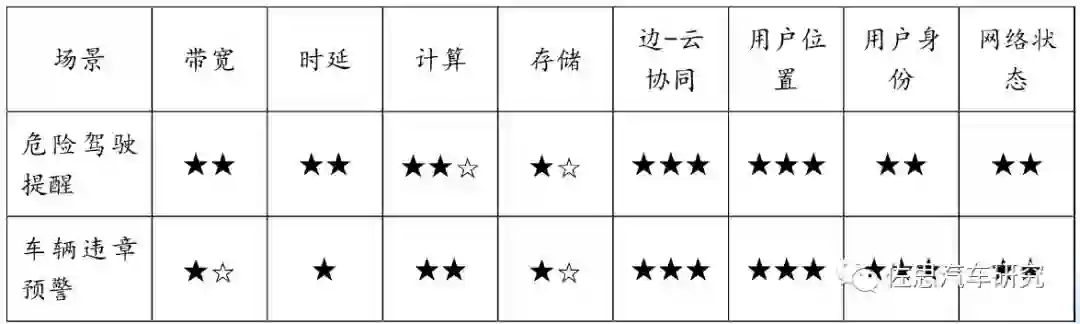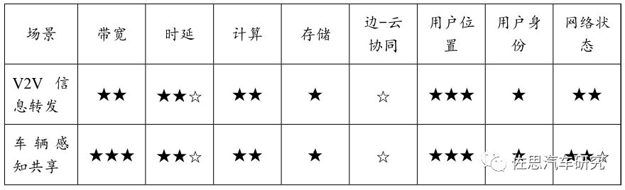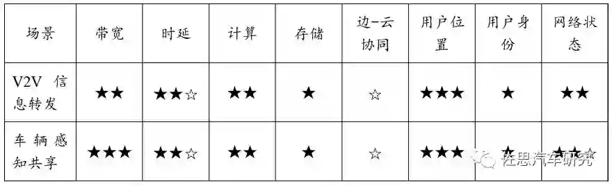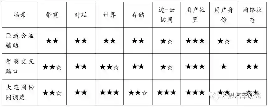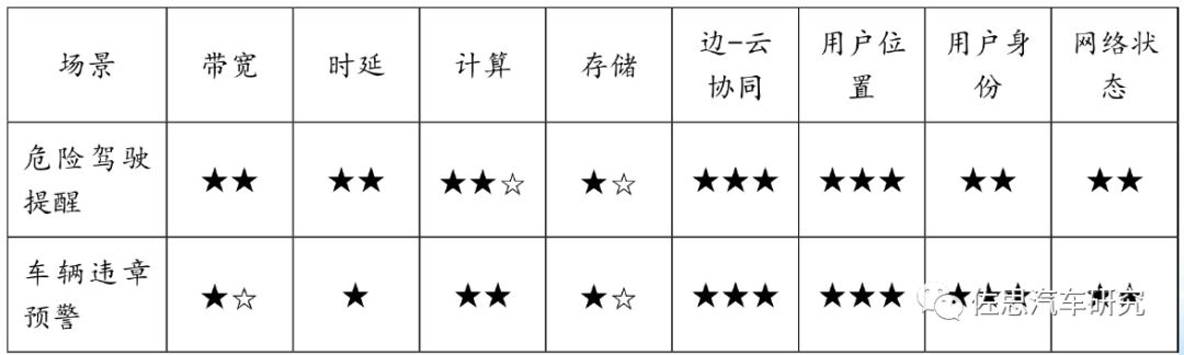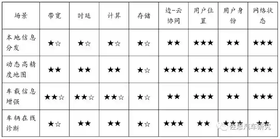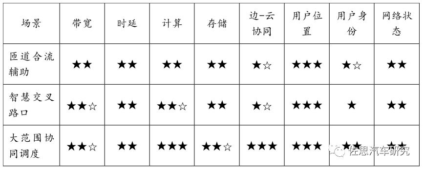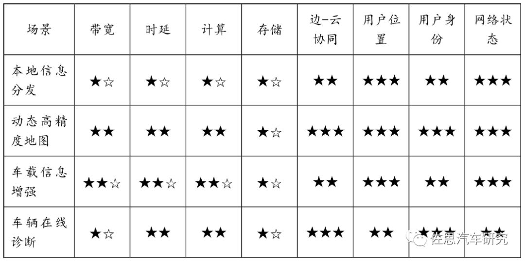 ● 边-云协同/用户位置/用户ID/网络状态:从零星至★★★分别代表了统计意义上对该要求的需求程度,零星表示完全不需要,★★★表示完全必需。