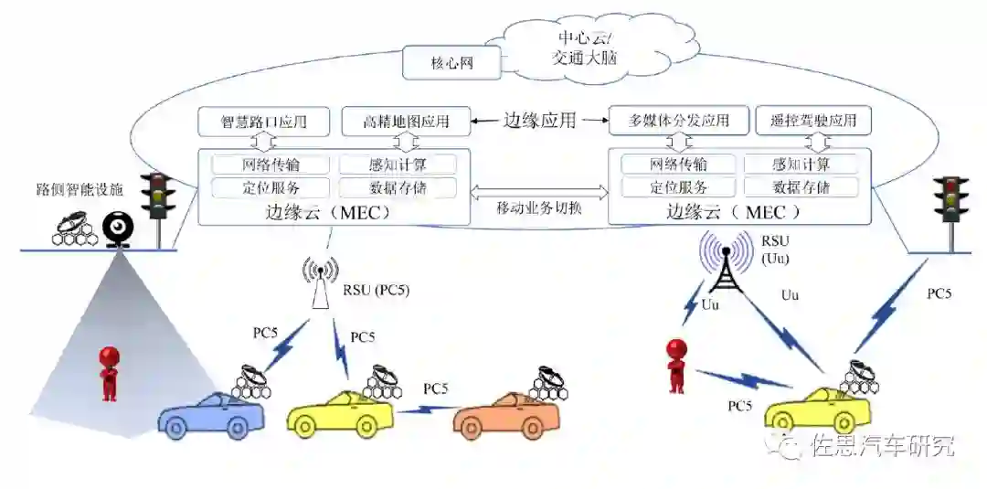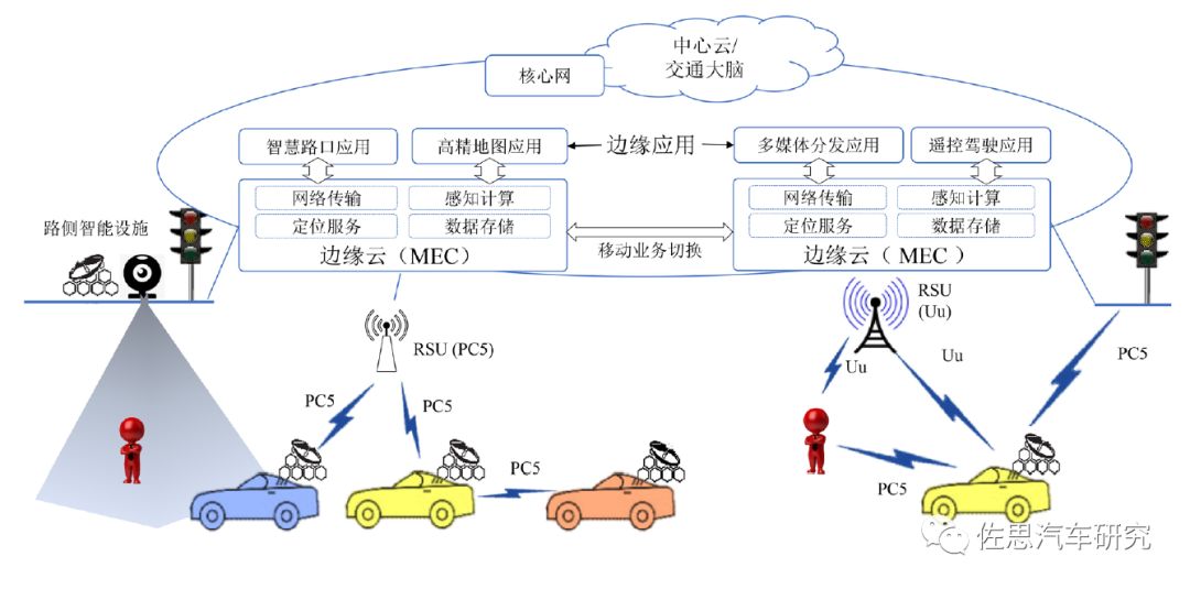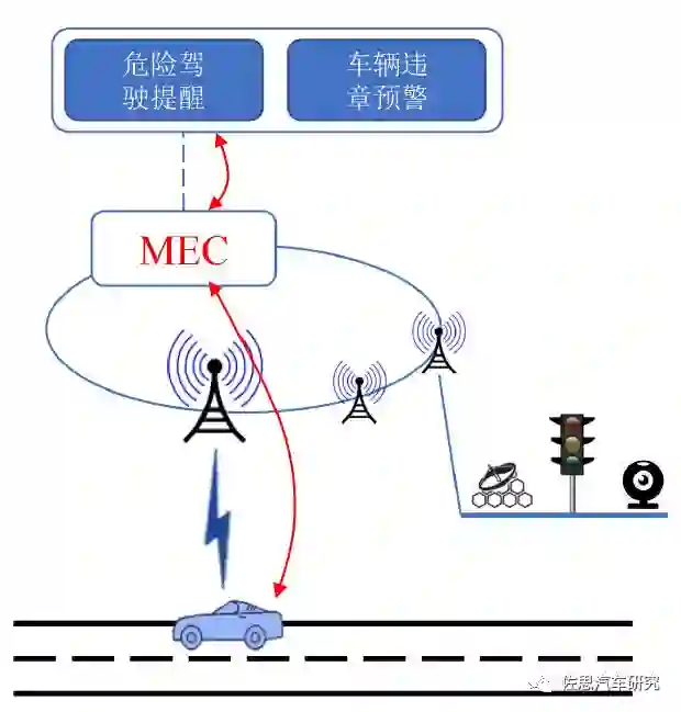 在此场景中,MEC提供用于监测信息分析及环境动态预测的计算能力,以及低时延、大带宽的通信能力。车辆可通过Uu通信模式与MEC直接交互,或通过PC5通信模式经RSU与MEC进行交互。
