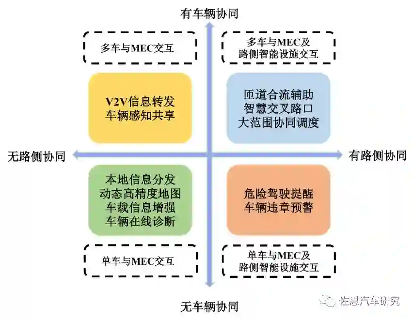 MEC与C-V2X融合场景,可按照“路侧协同”与“车辆协同”的程度进行分类。无需路侧协同的C-V2X应用可以直接通过MEC平台为车辆或行人提供低时延、高性能服务;当路侧部署了能接入MEC平台的路侧雷达、摄像头、智能红绿灯、智能化标志标识等智能设施时,相应的C-V2X应用可以借助路侧感知或采集的数据为车辆或行人提供更全面的信息服务。在没有车辆协同时,单个车辆可以直接从MEC平台上部署的相应C-V2X应用获取服务;在多个车辆同时接入MEC平台时,相应的C-V2X应用可以基于多个车辆的状态信息,提供智能协同的信息服务。