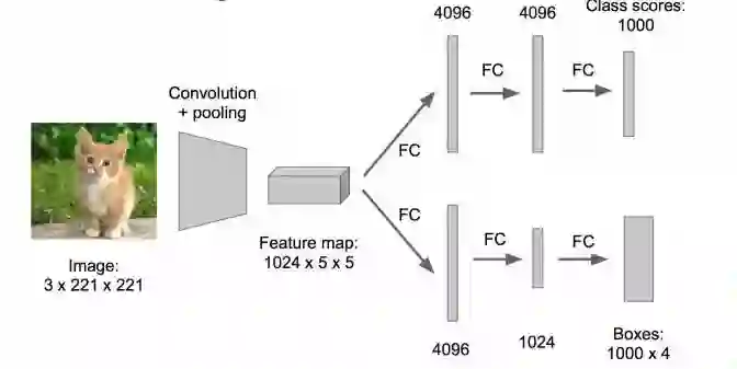 对一张图片,用各种大小的框(遍历整张图片)将图片截取出来,输入到CNN,然后CNN会输出这个框的得分(classification)以及这个框图片对应的x,y,h,w(regression)。