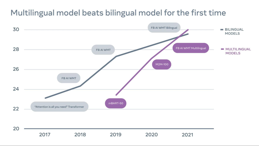 多语言翻译是一种很有吸引力的方法——它更简单,更具可扩展性,而且更适合低资源语言。但直到现在,对于高资源语言对,这种方法的效果还比不上与专门为这些语言对训练的双语模型。因此,在许多语言中,提供高质量的翻译通常需要组合使用多个双语模型,而低资源语言被抛在了后面。