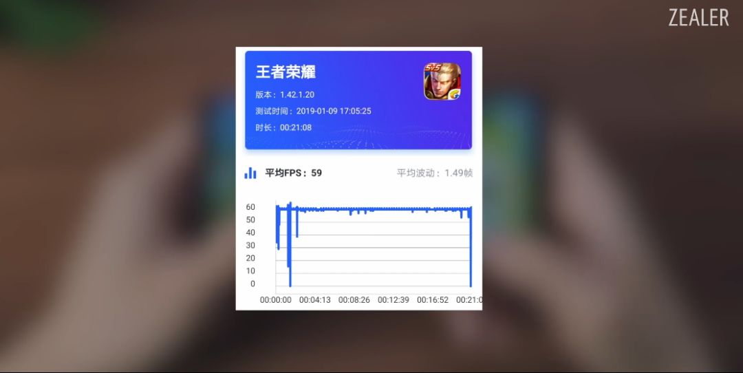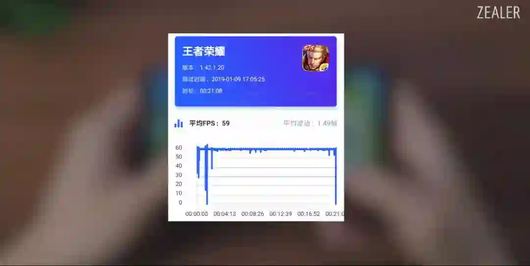 游戏上,王者荣耀平均 59 帧,波动 1.49 帧;
