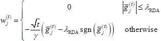 由于直接优化引入L1正则项的目标函数较为困难,为此Xiao于2009年在NIPS上提出L1-RDA算法,其核心思想为:通过Bregman距离(Bregman Divergence)构造对公式2的对偶形式,通过对对偶形式的优化求解结果(具体的对偶求解过程略)。RDA算法可以描述为: