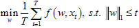 其中T表示观测样本数量,t表示某一观测样本的序号,函数f为输入为xt,参数为w的目标函数,‖.‖1表示L1正则约束。一般称第一个优化目标(公式1)为有限制条件的形式化,第二个目标(公式2)为无限制条件的形式化。L1正则约束的表述虽然简单,但对上述的两个目标函数的直接优化都是非凸优化,不易通过直接对梯度进行优化的方式获得结果。关于加入L1正则项后的优化方法有很多讨论,这里我主要介绍两种比较易于实现的方法,以供大家选择。
