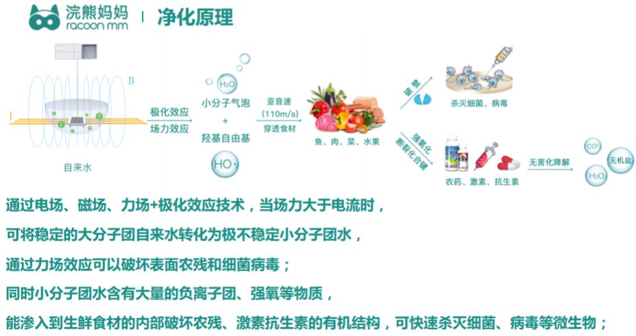 “浣熊妈妈”通过极化技术将稳定状态的大分子团水,转变为极不稳定的小分子团水,小分子团水中含有大量的负离子团、强氧等强氧化性物质,可以将食材表面及内部残留的有机农药、激素、抗生素以及致病微生物进行降解及灭活,经多家检测机构检测,降解率可达97%以上。