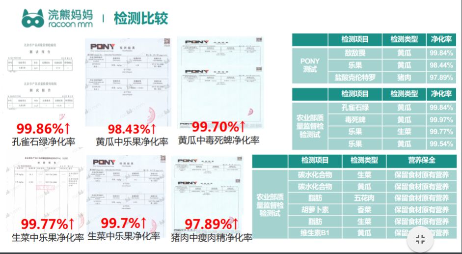 杨峰介绍,“利用超声波原理的食物净化器只能净化食品表面的农残,由于小分团子水拥有很强的渗透性,‘浣熊妈妈’可净化食品内部的农残。”