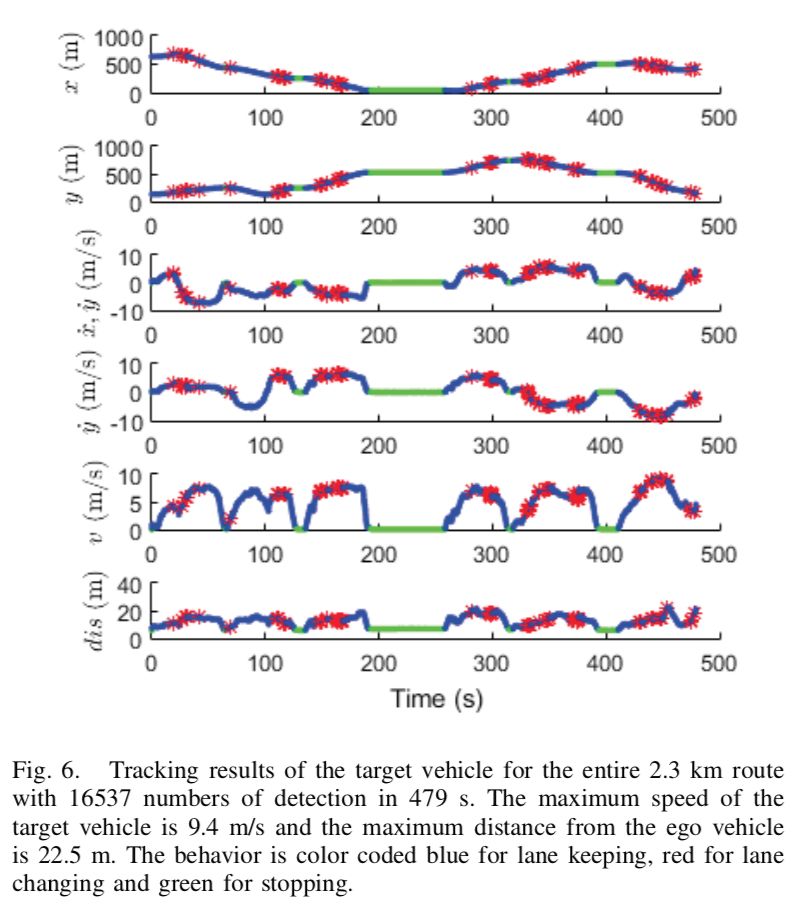 最后,作者提出在编码了道路环境的车道坐标系中执行行为推理来检查被追踪的车辆的状态。作者通过追踪领头车辆在执行诸如保持车道、路口停车启动、变换车道、超车及转向灯常见城市驾驶行为验证了他们提出的方法的可行性。领头车辆在2.3km长的路线上被联系追踪并将其驾驶行为进行了可靠地分类。