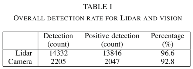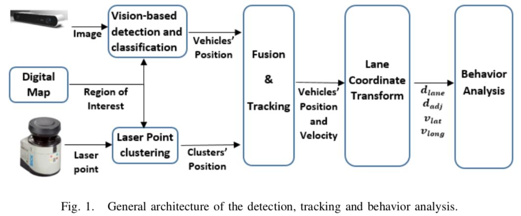 作者展示了一种实时车辆检测及追踪的系统来实现诸如城市环境中驾驶行为分析的复杂任务。作者提出了一种结合了单目相机和2D Lidar的鲁棒的融合系统。该系统充分利用了以下3个关键的部分:使用深度学习技术的鲁棒的车辆检测,从Lidar获得的高精度距离数据,以及预先知道的道路环境。相机与Lidar传感器的融合,数据关联以及跟踪管理全部都在考虑了传感器的特征之后在全局地图坐标系上执行。