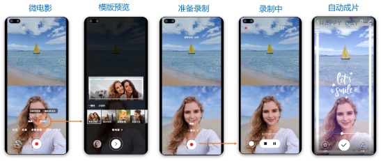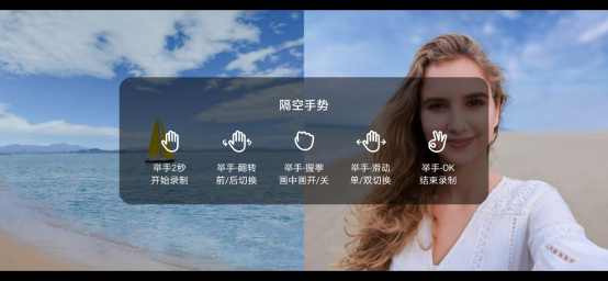 通过“举手”“翻转”“握拳”“滑动”“OK”共五种隔空手势,即可完成 Vlog 的隔空拍摄。另外还准备了简单易操作的一键拍功能,用户一键点击,即可跟随手机内置的拍摄模板拍摄 Vlog 作品。