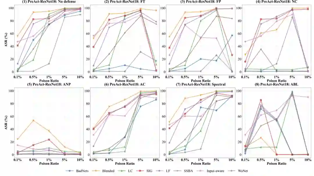 如下图所示,研究人员在不同的投毒比例下记录了攻防后的ASR。