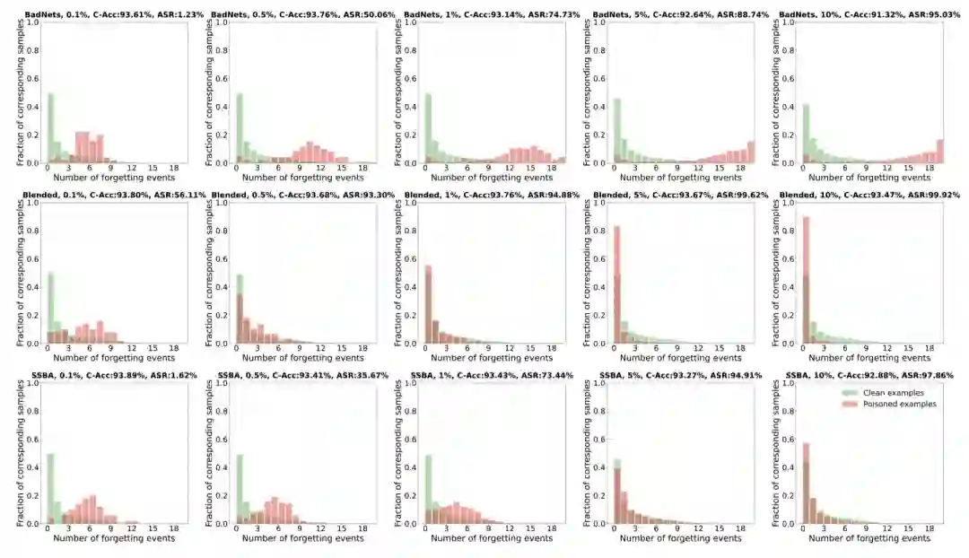 我们采用论文《An empirical study of example forgetting during deep neural network learning》中提出的研究方法,使用遗忘事件的数量来衡量后门的遗忘性,我们的结果如下图所示: