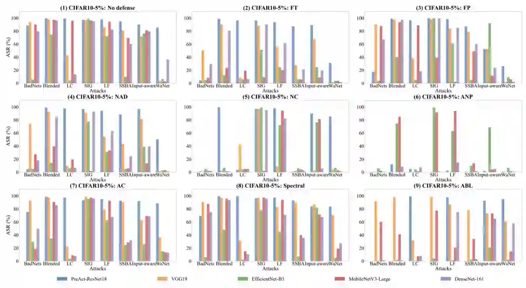 研究人员在4个数据集(CIFAR-10、CIFAR-100、GTSRB、Tiny ImageNet),5个模型结构(PreAct-ResNet18, VGG19, EfficientNet-B3, MobileNetV3-Large, DenseNet-161),8个攻击,9个防御,5个投毒浓度(0.1%、0.5%、1%、5%、10%)下进行了实验(正常的训练流程,考虑到普适性没有使用复杂的预处理)。