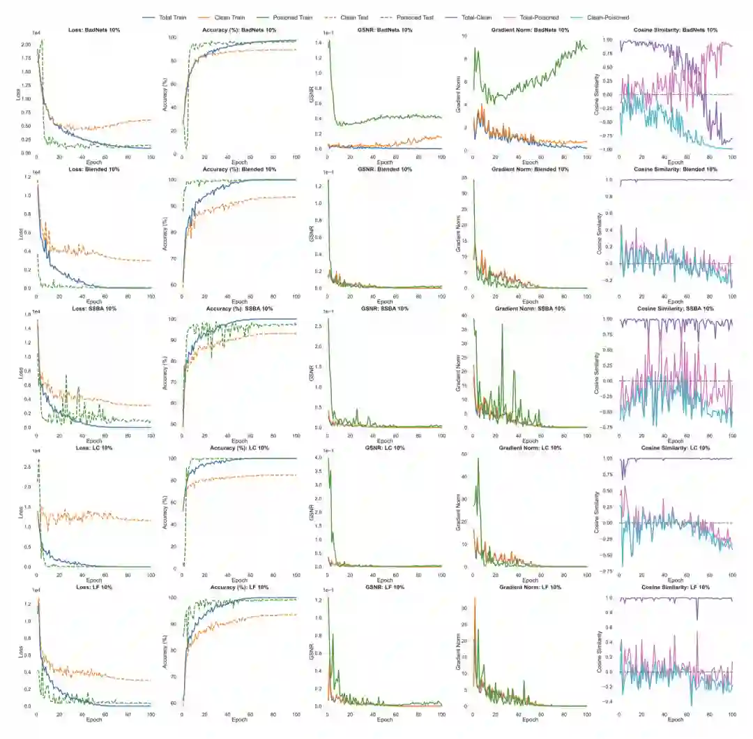 为了解释这样的现象,我们首先观察到在训练的早期阶段,中毒样本的梯度信噪比明显大于干净样本的梯度信噪比 (如第三列所示)。中毒样本的高梯度信噪比表明,后门具有更好的泛化性能,这与中毒测试样本上更高的准确性(ASR)和更低的损失函数是一致的。