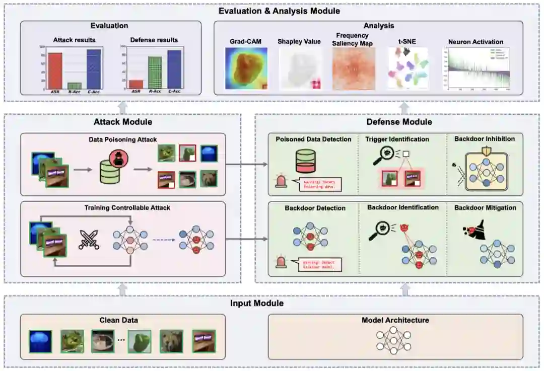 为了缓解这种困境,我们建立了一个全面的后门学习基准,称为BackdoorBench。它由输入模块、攻击模块、防御模块以及评估和分析模块组成。