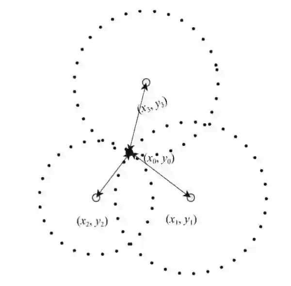 上图中的(x1,y1)、(x2,y2)、(x3,y3)是3个无线基站的地理坐标,同一部手机到达这3个基站的时间乘以光速就是手机距离基站的距离,分别以基站坐标为圆心以距离为半径画圆,3个圆相交的地方就是手机的位置(x0,y0)。