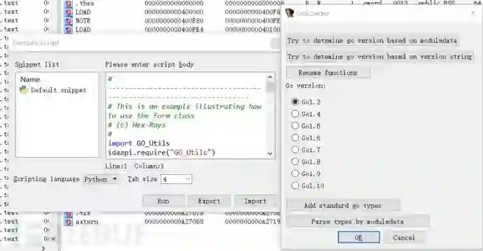 从Github下载下来后,将脚本拷贝到IDA目录的python文件夹下,重启IDA,菜单选择File-Script Command..导入go_entry.py并运行。