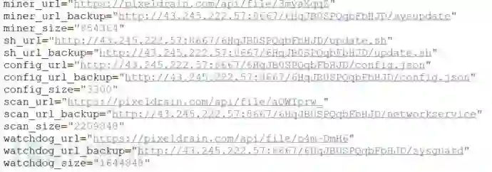 在/etc下下载了config.json(挖矿配置)、sysupdate(XMR挖矿软件)、update.sh(本脚本)、networkservice(scanner 扫描并入侵其他的主机)、sysguard(watchdog 用于监控并保证病毒的正常运行以及更新)并保证他们以root权限运行。