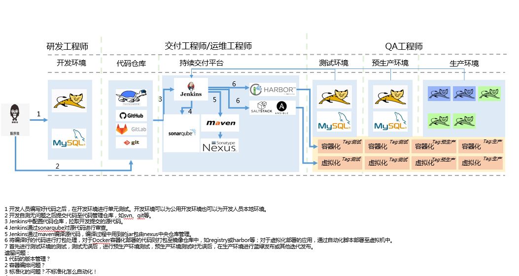 在传统行业中,还是有很多容器不适应或是正在适应的应用,数据库跑在容器中也是一个挑战,故在我目前所设计的方案中,容器只是运行web应用,更多的是配合建立持续交付平台,这包括以下组件:svn/git、Jenkins、maven+nexus、sonarqube、jmeter、selenium、nginx、tomcat、docker、harbor等等。