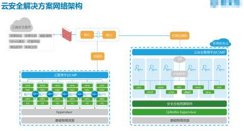 多云管理是在底层基础资源层,通过建立基础资源池整合内部私有云、外部公有云和行业云的资源形成统一的计算资源池、存储资源池、网络资源池和安全资源池,安全资源池还是比较费劲一些,但是也不难,现在方案都很成熟,主要就是一个引流+客户端。这里奉上一个安全厂商提供的云安全的解决方案,供参考: