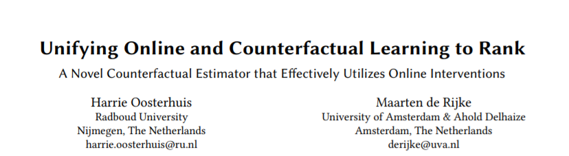 基于用户交互来优化排名系统是一个被广泛研究的问题。基于用户交互的优化排名系统的最先进方法分为在线方法(通过直接与用户交互进行学习)和反事实方法(通过历史交互进行学习)。现有的在线方法在没有在线干预的情况下会受到阻碍,因此不应该被用到反事实方法中。相反,反事实的方法不能直接从在线干预中获益。我们提出了一种新的干预感知估计器,用于反事实和在线学习排序(LTR)。随着干预感知估计器的引入,我们的目标是连接在线/反事实LTR部门,因为它在在线和反事实场景中都被证明是非常有效的。通过使用基于日志策略行为和在线干预(在收集点击数据期间对日志策略所做的更改)的校正,估计器可以校正位置偏差、信任偏差和项目选择偏差的影响。我们的实验结果,在一个半合成的实验设置中进行,结果表明,不像现有的反事实LTR方法,干预感知估计器可以从在线干预大大获益。