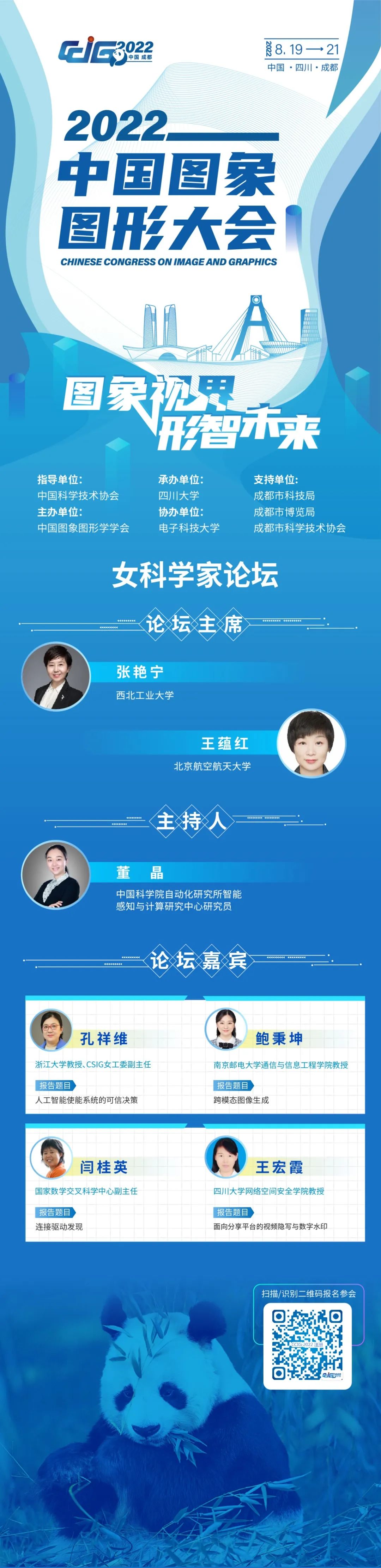 “世界需要科学,科学需要女性”,女性科技人才是科技人才队伍的重要组成部分,是我国科技事业十分重要的力量。本论坛主要面向图象图形学领域的女科学家举办的特色论坛,旨在通过组织和开展国内外学术交流,鼓励更多的女性科技工作者参与学术活动,聚合优秀科技女性树立榜样,提升女科技工作者的参与度、认同感和学术影响力,助力女性科技人才发挥更大作用。