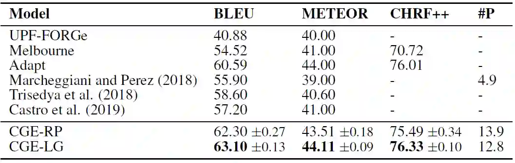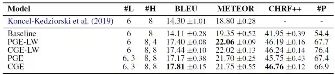 下表是在数据集WebNLG上的实验结果。CGE比之前的最好模型在BLEU值上高5-6个点,在METEOR上高2-3个点,表明其生成文本的拟合度是显著更好的。