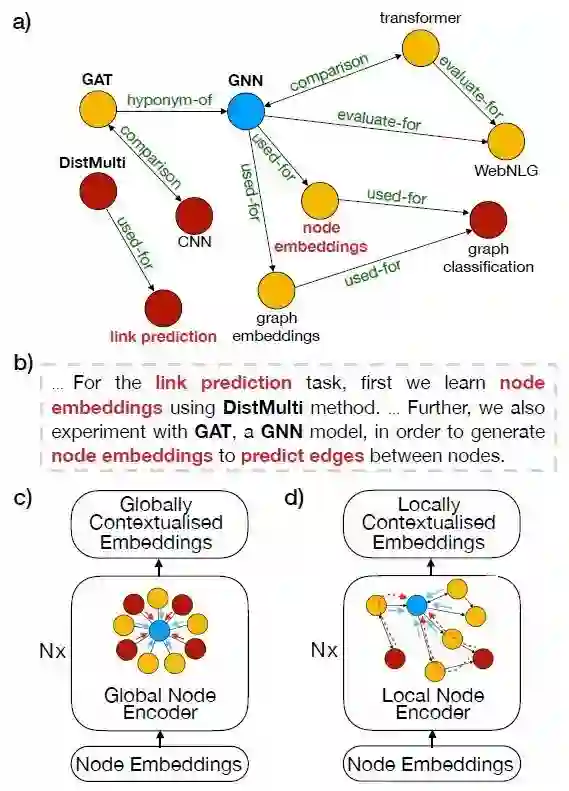 过去的知识图谱文本生成方法大都使用了图卷积网络GCN,它们要么是用全局的结点(c)——假定每个结点都和其他结点相连,要么是用局部的结点(d)——只有一部分结点相连。前者忽略了图的结构,而后者缺乏全局信息。