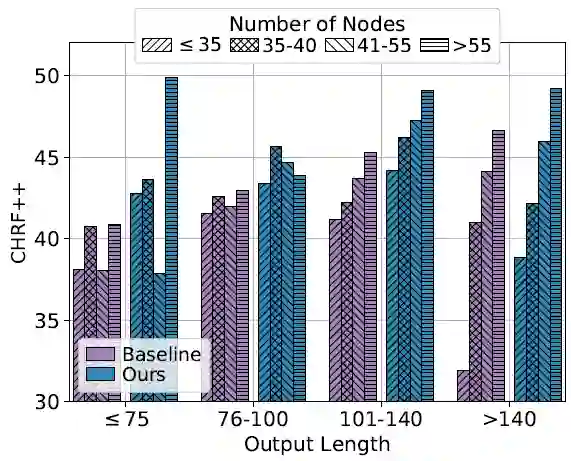 值得注意的是,当生成的长度更长,而结点数量很少的时候,本文模型能显著优于基线模型,这表明本文模型能够在图较小的时候充分利用结点和结点之间的知识,从而生成长文本。