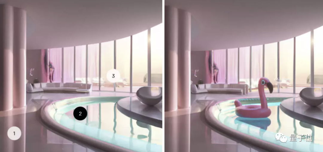 比如在左图标“2”的位置P一个火烈鸟泳圈,DALL-E 2会把水面倒影这种细节也处理到位。