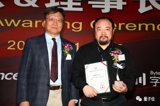 2019年授予安天科技集团创始人、董事长肖新光先生和百度公司深度学习平台飞桨总架构师于佃海先生该奖项。CCF理事长高文为他们颁奖。