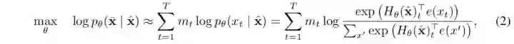第二种是像bert这种的auto-encoder模型,随机mask掉句子中若干个token,然后依据上下文预测被mask掉的token,auto-encoder的loss的定义如下: