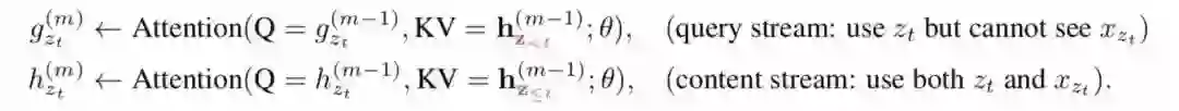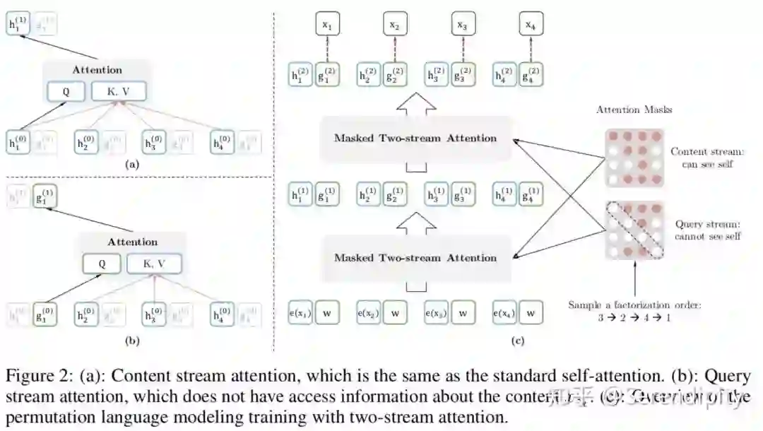 因为普通的transformer无法融合因子分解序和auto-regressive的loss,例如2个不同的因子分解序1->3->2->4->5和1->3->2->5->4,第1个句子的4和第2个句子的5在auto-regressive的loss下的attention结果是一样的,因此第1个句子的4和第2个句子的5在vocab上的预测概率分布也是一样的,这就不符合常理了。造成这种现象的原因在于,auto-regressive的loss是利用前t-1个token的token信息和位置信息预测第t个token,然而因子分解序的第t个token在原始句子中的位置是不确定的,因此需要额外的信息表示因子分解序中需要预测的token在原始句子中的位置。为了达到目的,xlnet使用双流的multi-head attention+ffn,查询流g利用因子分解序中前t个位置的位置信息和前t-1个位置的token信息计算第t个位置的输出信息,而内容流h利用因子分解序中前t个位置的位置信息和token信息计算第t个位置的输出信息。在预训练的过程中,使用g计算auto-regressive的loss,然后最小化的loss的值,顺带着训练h。预训练完成之后,放弃g,使用h无缝切换到普通transformer的fine-tune。