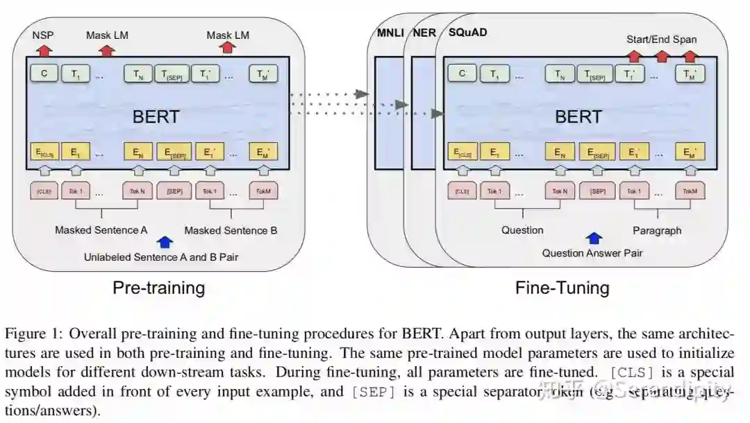 在bert之前,将预训练的embedding应用到下游任务的方式大致可以分为2种,一种是feature-based,例如ELMo这种将经过预训练的embedding作为特征引入到下游任务的网络中;一种是fine-tuning,例如GPT这种将下游任务接到预训练模型上,然后一起训练。然而这2种方式都会面临同一个问题,就是无法直接学习到上下文信息,像ELMo只是分别学习上文和下文信息,然后concat起来表示上下文信息,抑或是GPT只能学习上文信息。因此,作者提出一种基于transformer encoder的预训练模型,可以直接学习到上下文信息,叫做bert。bert使用了12个transformer encoder block,在13G的数据上进行了预训练,可谓是nlp领域大力出奇迹的代表。