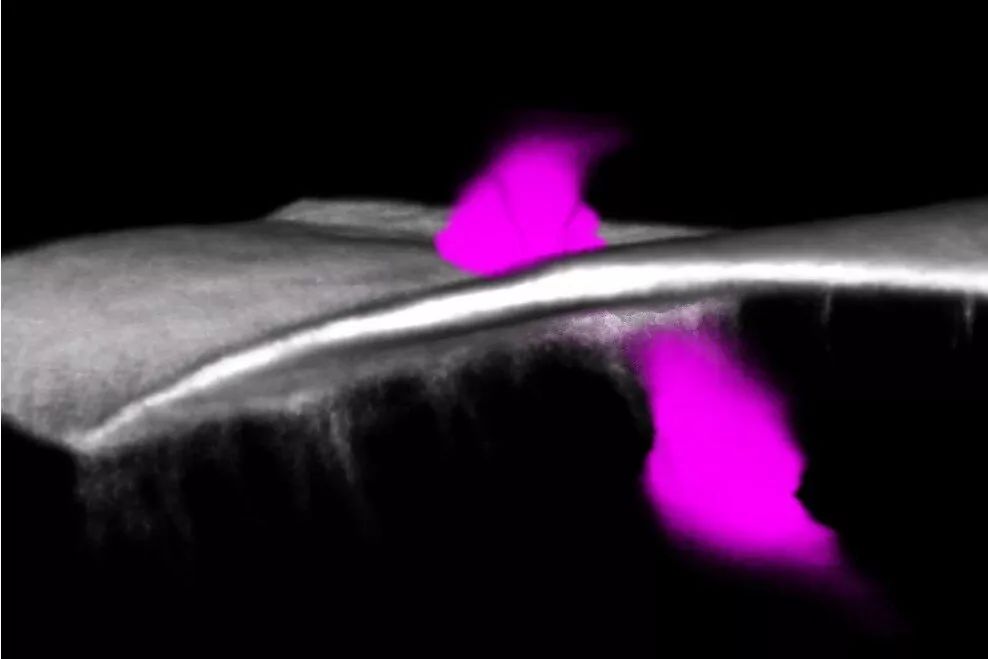 免疫细胞(洋红色)破坏基底膜以进入癌细胞。图片来源:布里斯托大学
