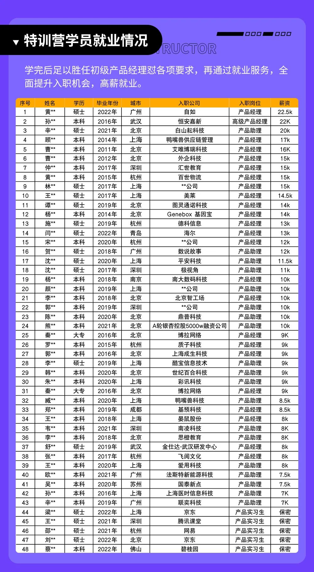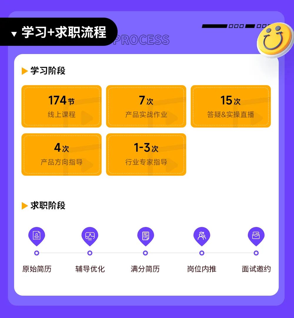 学习的最终目的是成为企业需要的产品人才,成功就业。业内其他产品课程,上完课就“戛然而止”了,导致很多学员依旧不懂互联网公司对产品经理有何要求,如何针对性优化简历,如何寻找适合自己的岗位机会,如何在面试中充分展现自己的产品能力,如何进行合理的薪资谈判……
