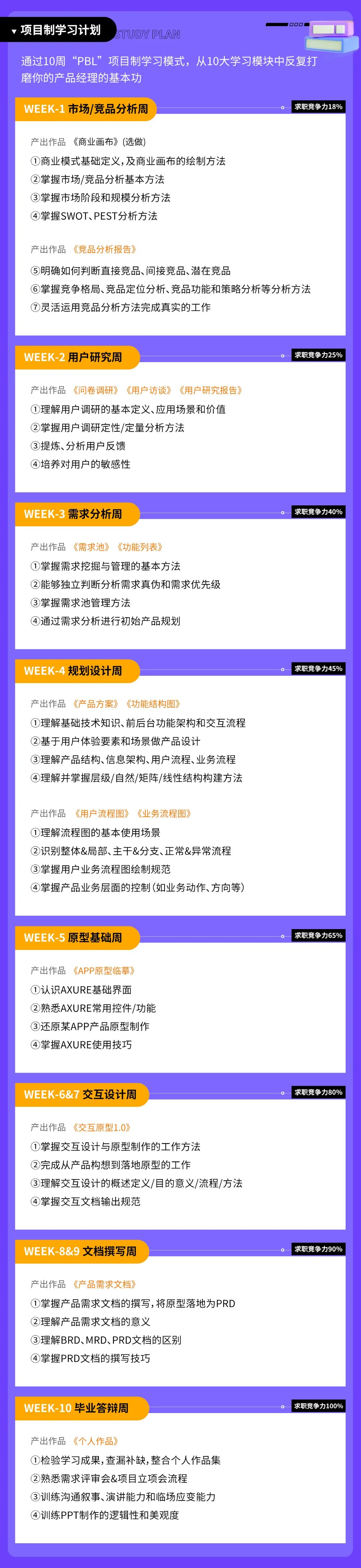 与产出作品相匹配的,是为你量身定制的“10周线上陪伴式教学模式”,所学内容源自BAT产品培养体系和市场上企业的招聘需求,每一周你都会通过“大量刻意练习+输出倒逼输入”掌握一个产品模块的方法论,10周后你就能达到或超过企业招聘标准,胜任1年以上经验要求的产品岗。