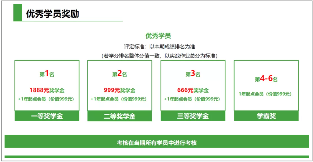 课程还安排了丰厚的优秀学员奖励,按时按质完成7次大作业+1次答辩,排名前三可立返现金!最高获1888元奖金+1年起点会员(价值999元)!