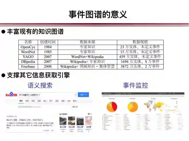 构建一个事件图谱能丰富现有的以实体为核心的知识图谱。除此之外,它能支撑很多信息检索,比如说问地震遇难人数,它能给一个具体的数。另外还可以对一个企业或者是一支股票进行很多事件的监控。